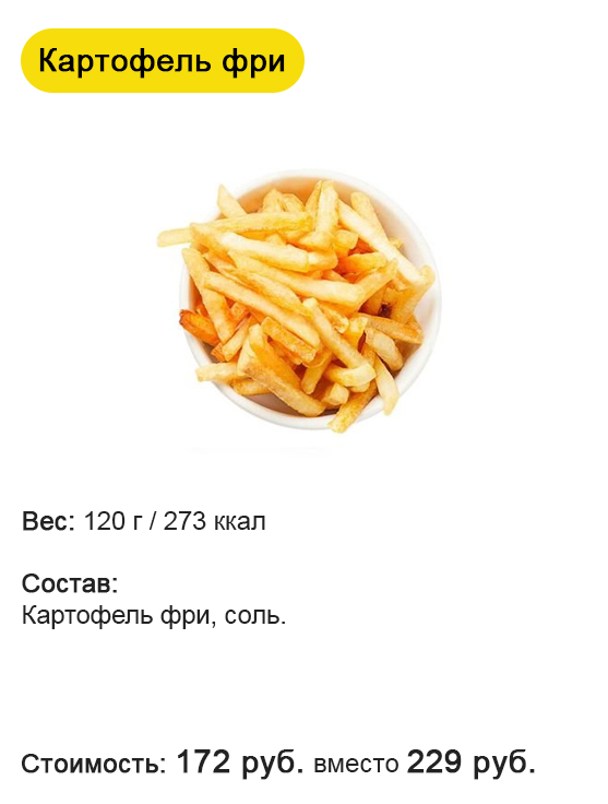 • Картофель фри 120 г –171 руб. вместо 229 руб.=> Посмотреть все ПОКЕ, САЛАТЫ, ЗАКУСКИ на сайте Капибара*
