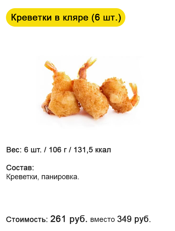 ✓ Темпура "Карабас" (краб (имитация), сыр, салат, кляр, панировочные сухари, унаги соус, кунжут).• Аппетитный (54 шт/ 1620 г/ 216.2 ккал) – 2040 руб. вместо 2399 руб.