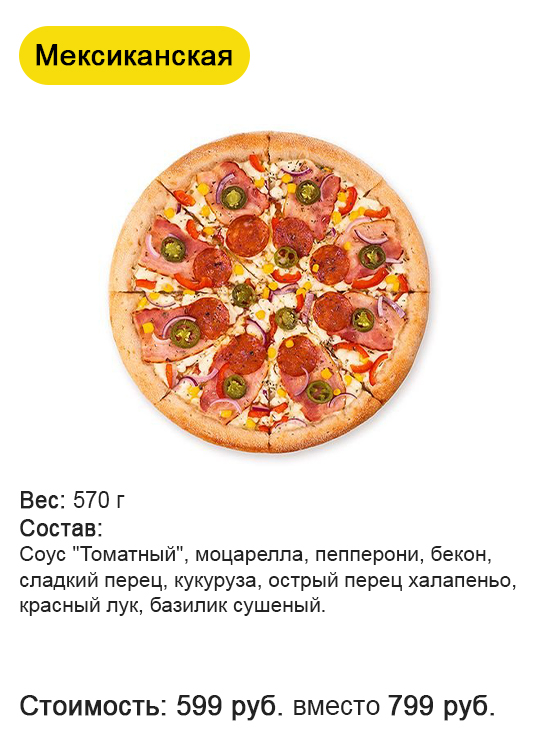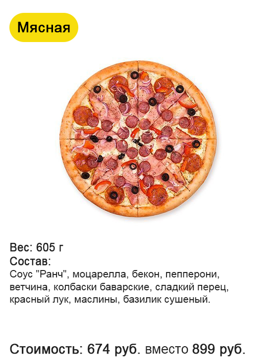 • Мясная (32 см/ 605 г/ 325.4 ккал) – 675 руб. вместо 899 руб.