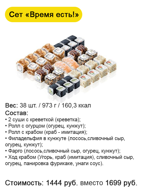 • Время есть! (38 шт/ 973 г/ 160.3 ккал) – 1445 руб. вместо 1699 руб.