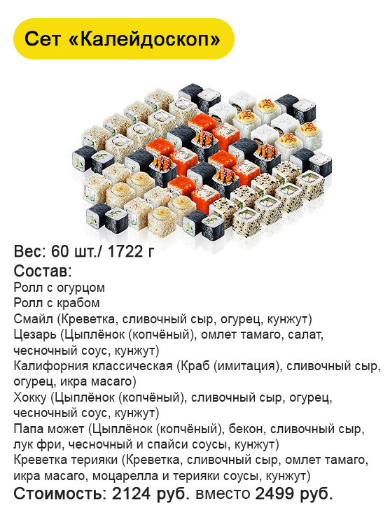 • Капибара-сет (32 шт/ 1010 г/ 182.8 ккал) – 1513 руб. вместо 1780 руб.