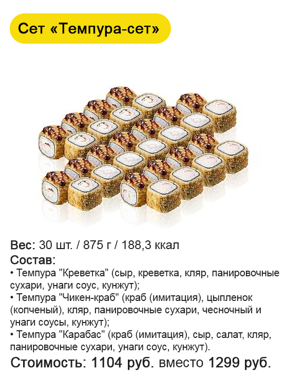 ✓ Бонито (лосось, сыр, огурец, стружка тунца).• Темпура-сет (30 шт/ 875 г/ 188.3 ккал) – 1105 руб. вместо 1299 руб.