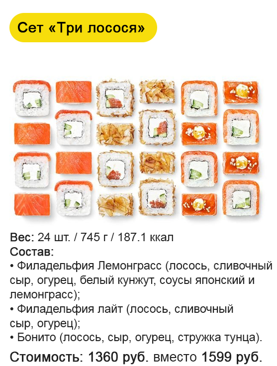 • Сет Три лосося (24 шт/ 745 г/ 187.1 ккал) - 1359 руб. вместо 1599 руб.