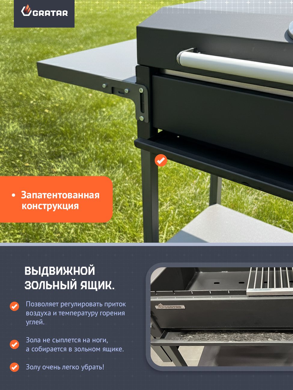 • Выдвижной зольник — обеспечивает максимальную эффективность и конвекцию. Собирает золу и равномерно распределяет жар, позволяя более точно управлять температурой в широком диапазоне.