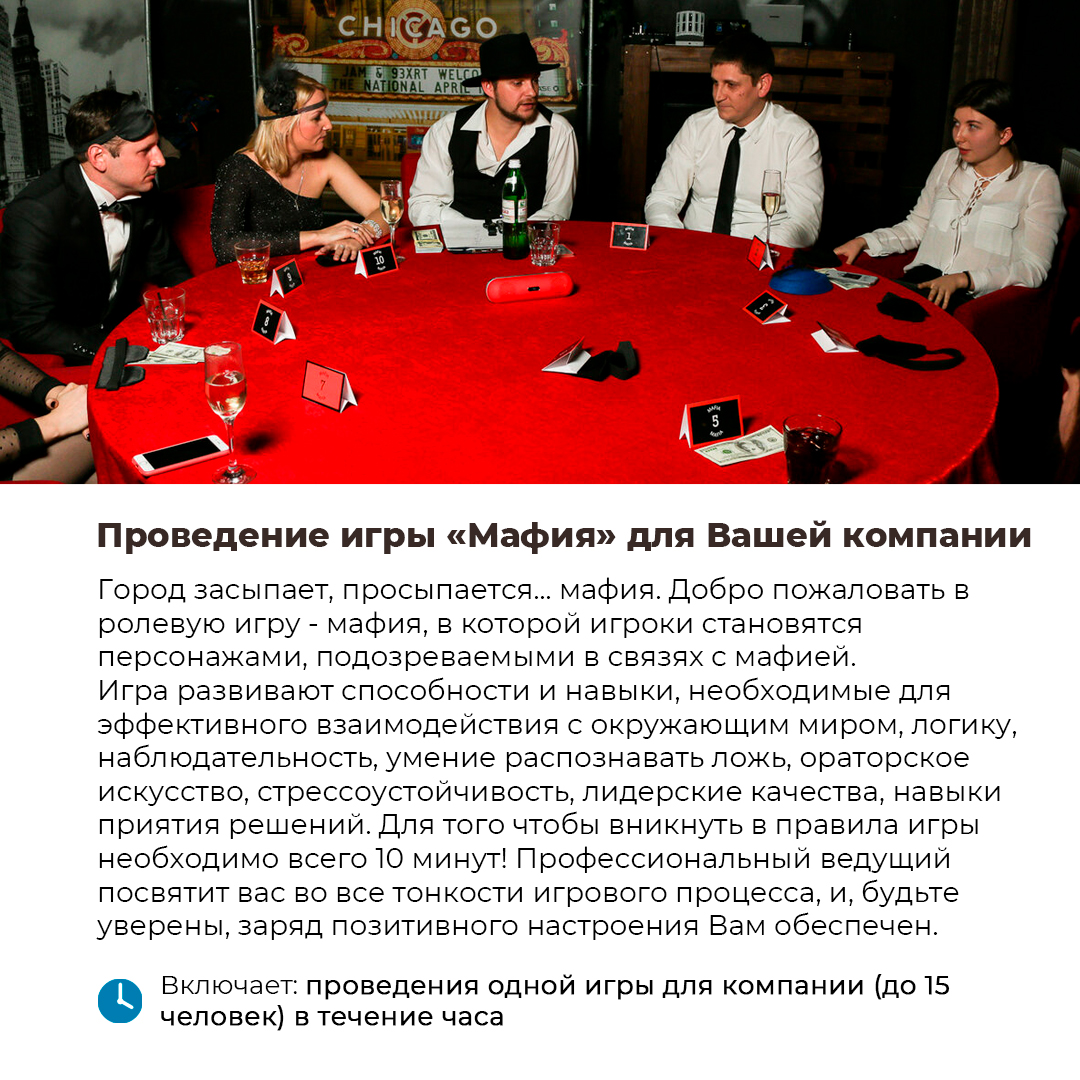 - Проведение игры «Мафия» для Вашей компании → (смотреть видео)