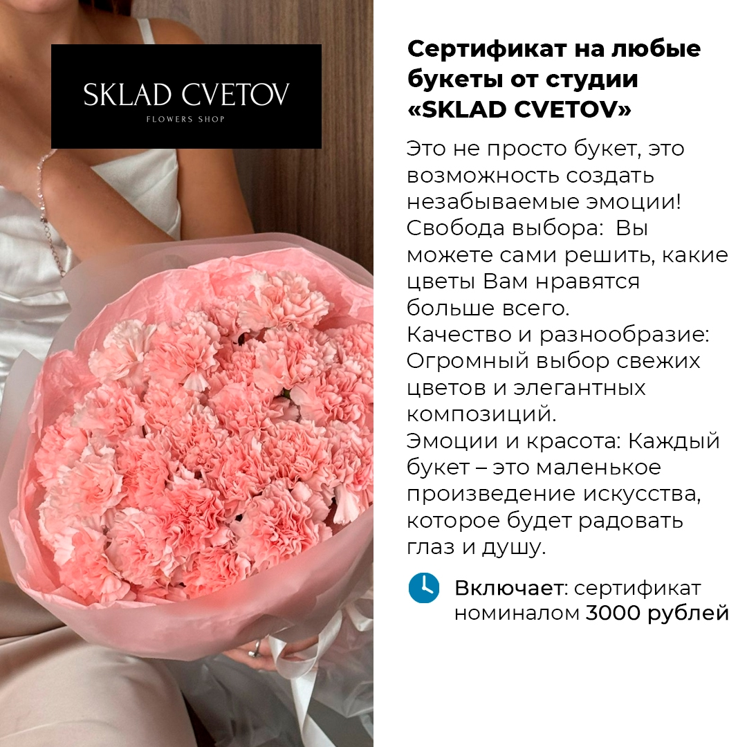 - Сертификат номиналом (3000 руб.) на любые букеты от студии «SKLAD CVETOV»