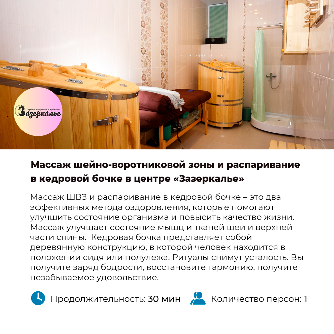 - Массаж шейно-воротниковой зоны и распаривание в кедровой бочке в центре «Зазеркалье»