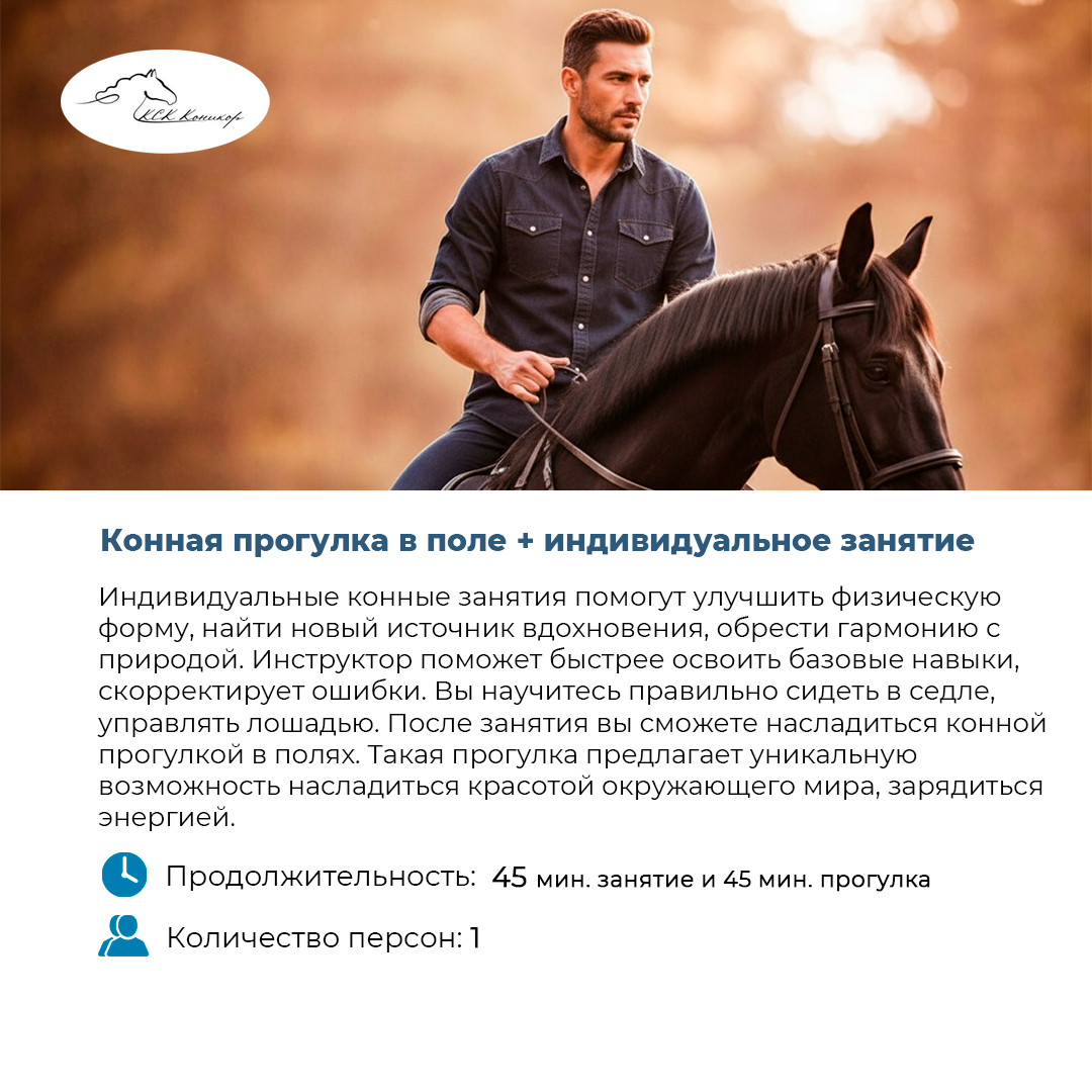 - Конная прогулка в поле + индивидуальное занятие в КСК «Коникор»