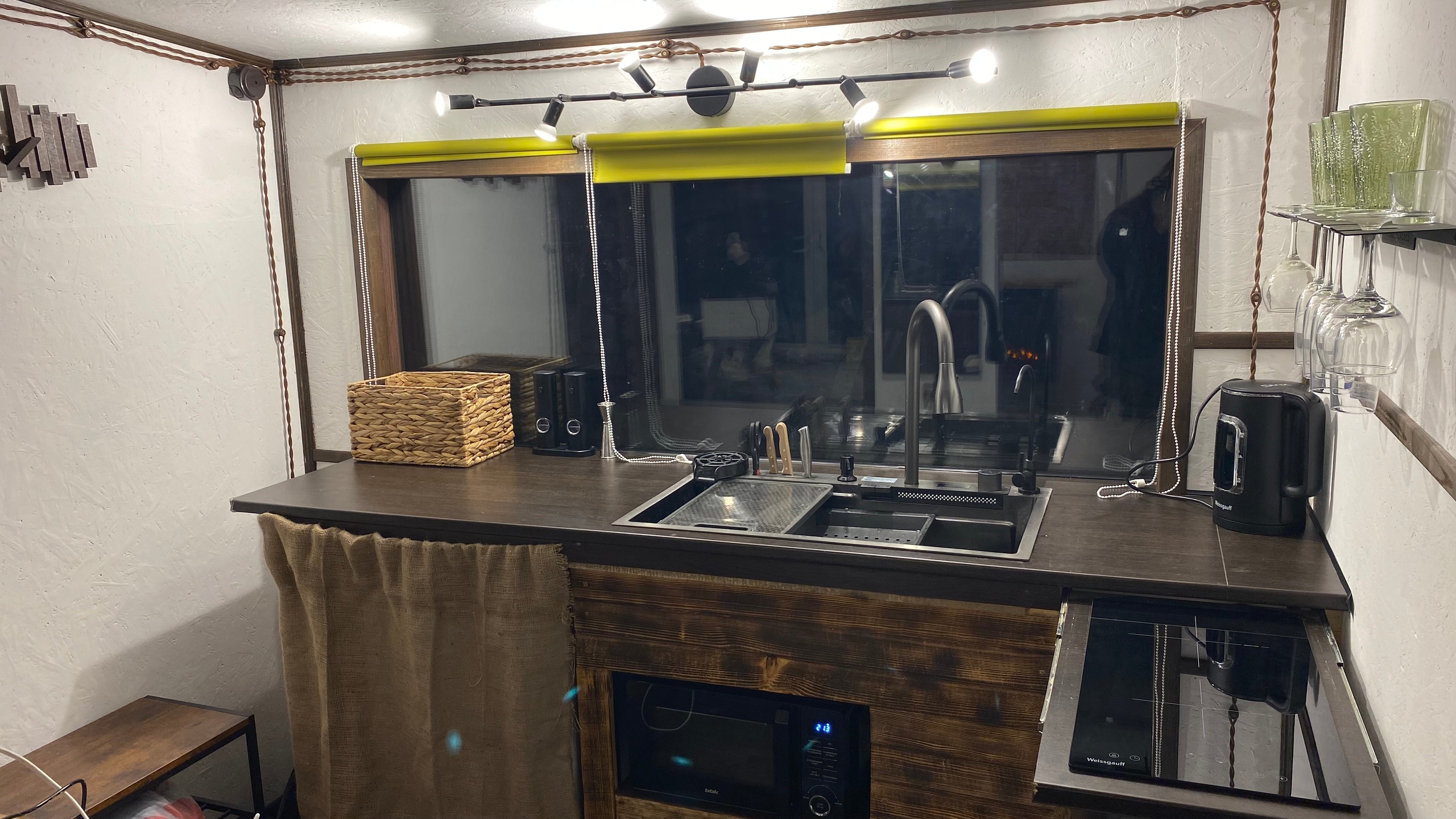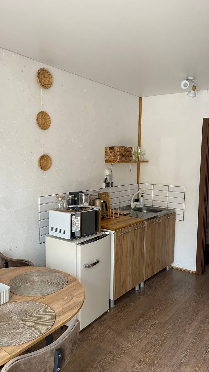 • Кухонная зона (микроволновка, холодильник, плита, посуда, чайник, чай и кофе)