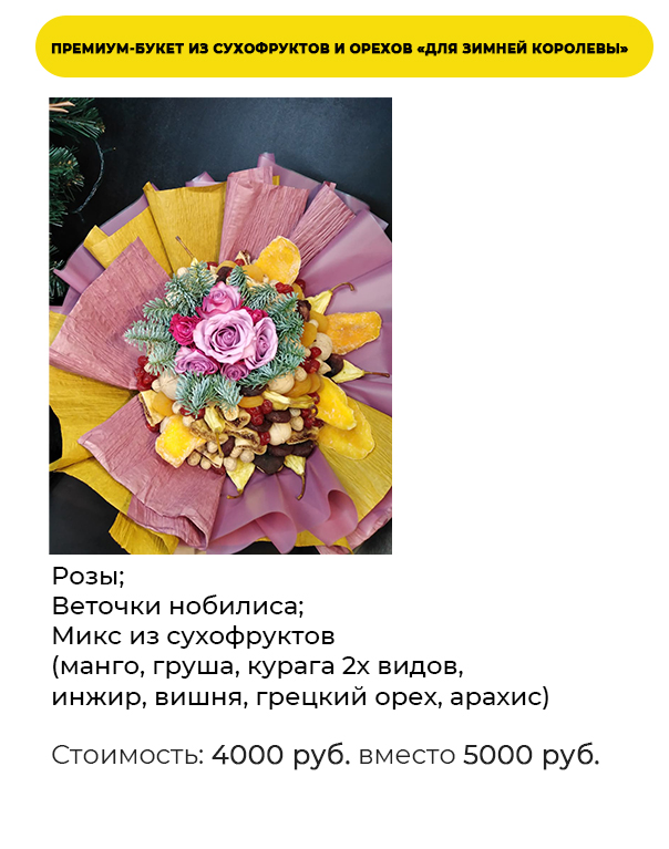 ПРЕМИУМ-БУКЕТ ИЗ СУХОФРУКТОВ И ОРЕХОВ «ДЛЯ ЗИМНЕЙ КОРОЛЕВЫ»